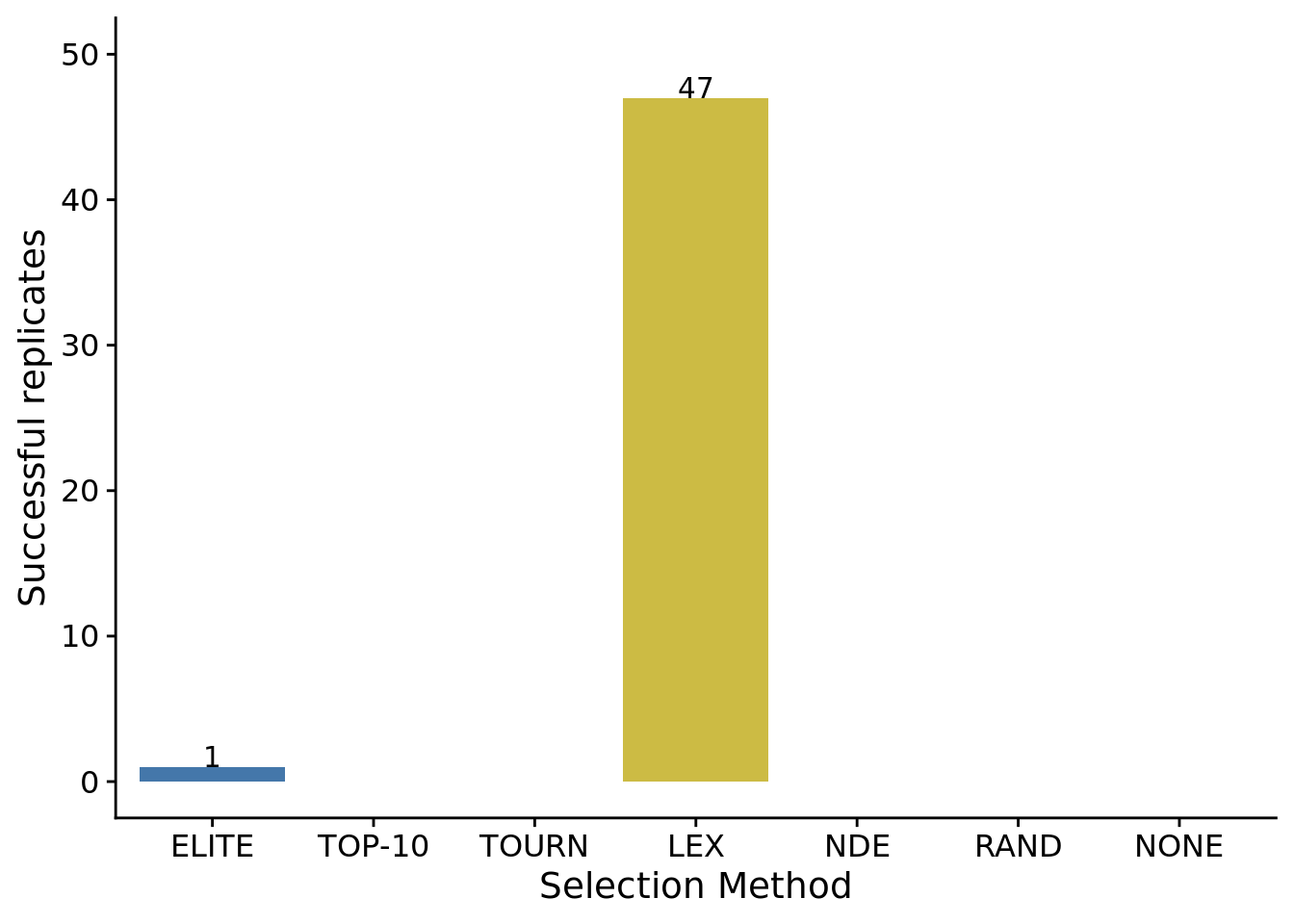selection_method_labels <- c("ELITE", "TOP-10", "TOURN", "LEX", "NDE", "RAND", "NONE")6.4 Number of successful replicates
