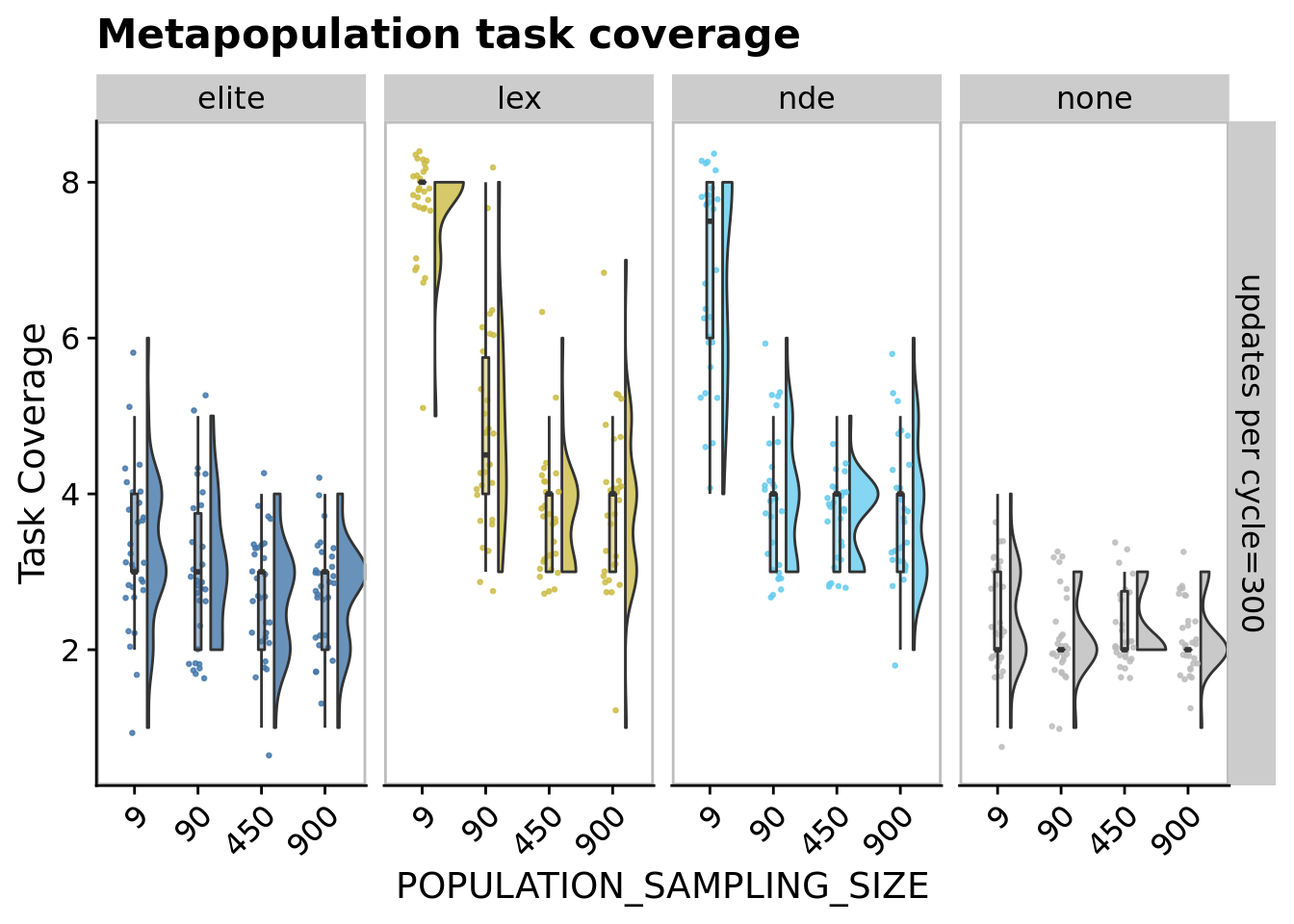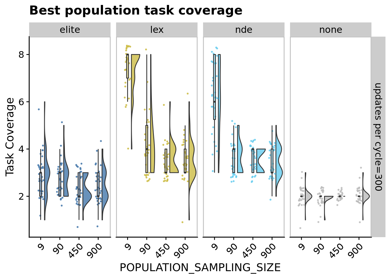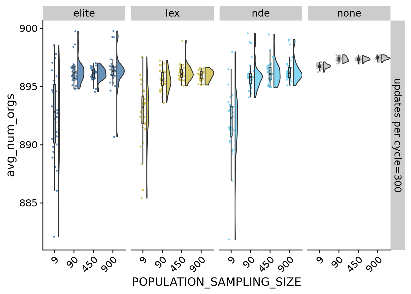 Overall, we found that the effect of propagule size varied by selection scheme. For elite selection and the no-selection control, sample size had little effect. For lexicase and non-dominated elite selection, the smallest propagule size (1% of the maximum population size) resulted in significantly better outcomes than using larger propagule sizes (e.g., 100% of the maximum population size).