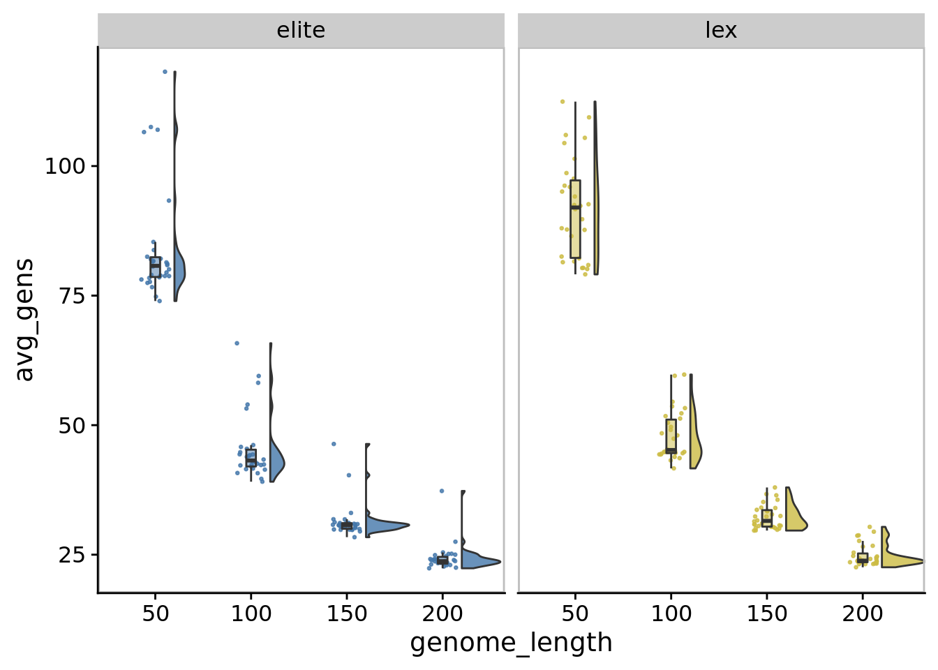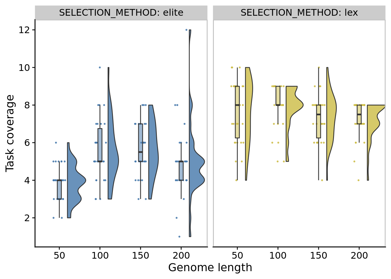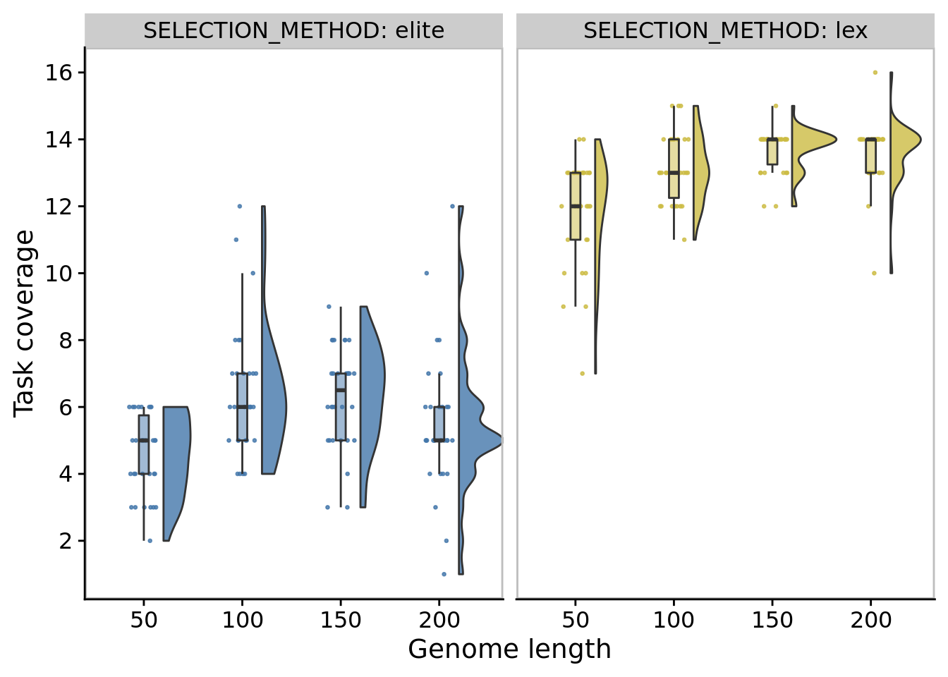 In our main experiments, we limited genome length to 100 instructions. We ran a supplemental experiment to evaluate whether this limit substantially affected the directed evolution performance. Specifically, for each of elite and lexicase selection, we ran 30 replicates of digital directed evolution with the following genome length configurations: 50, 100 (default used in our main experiments), 150, and 200.