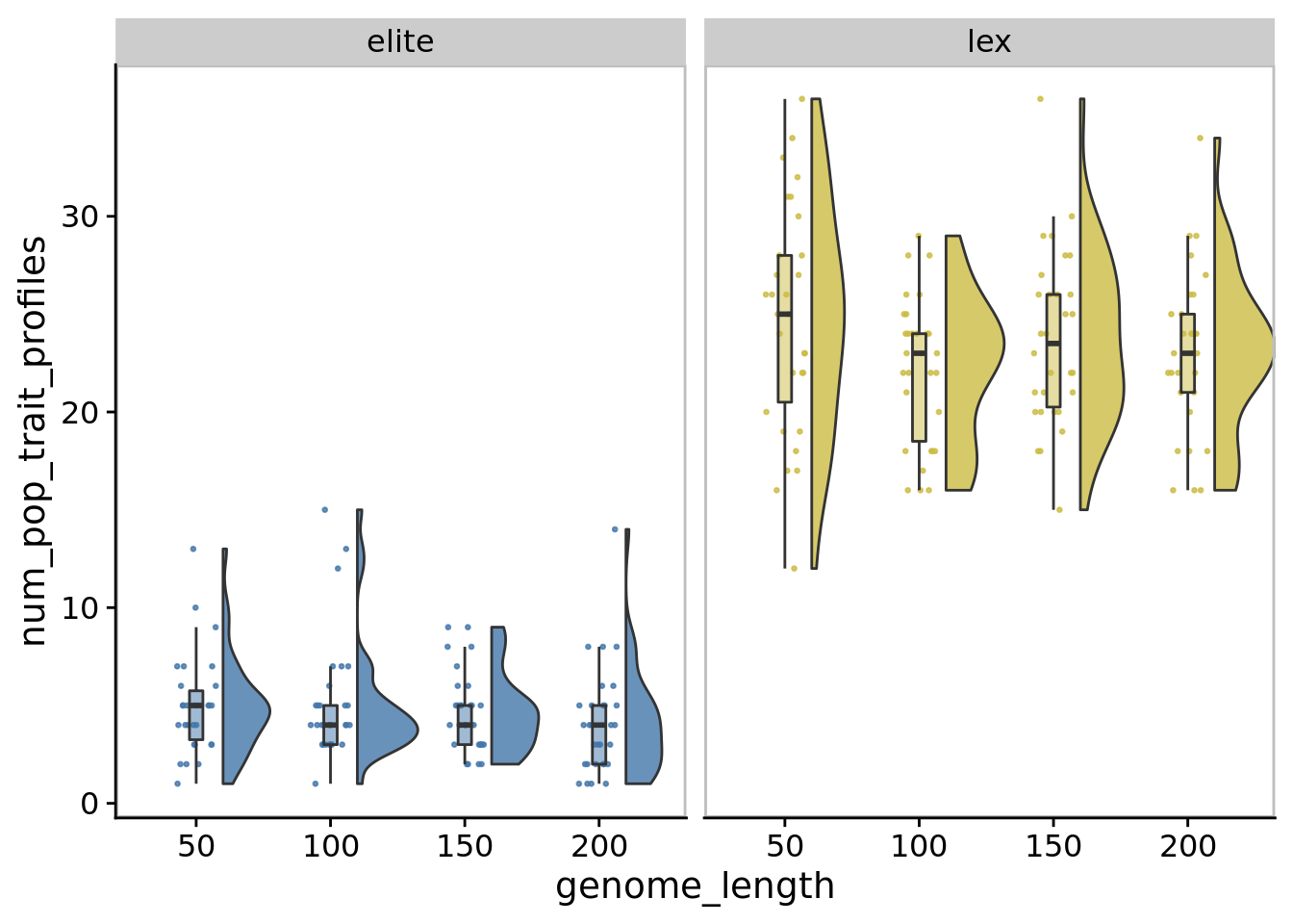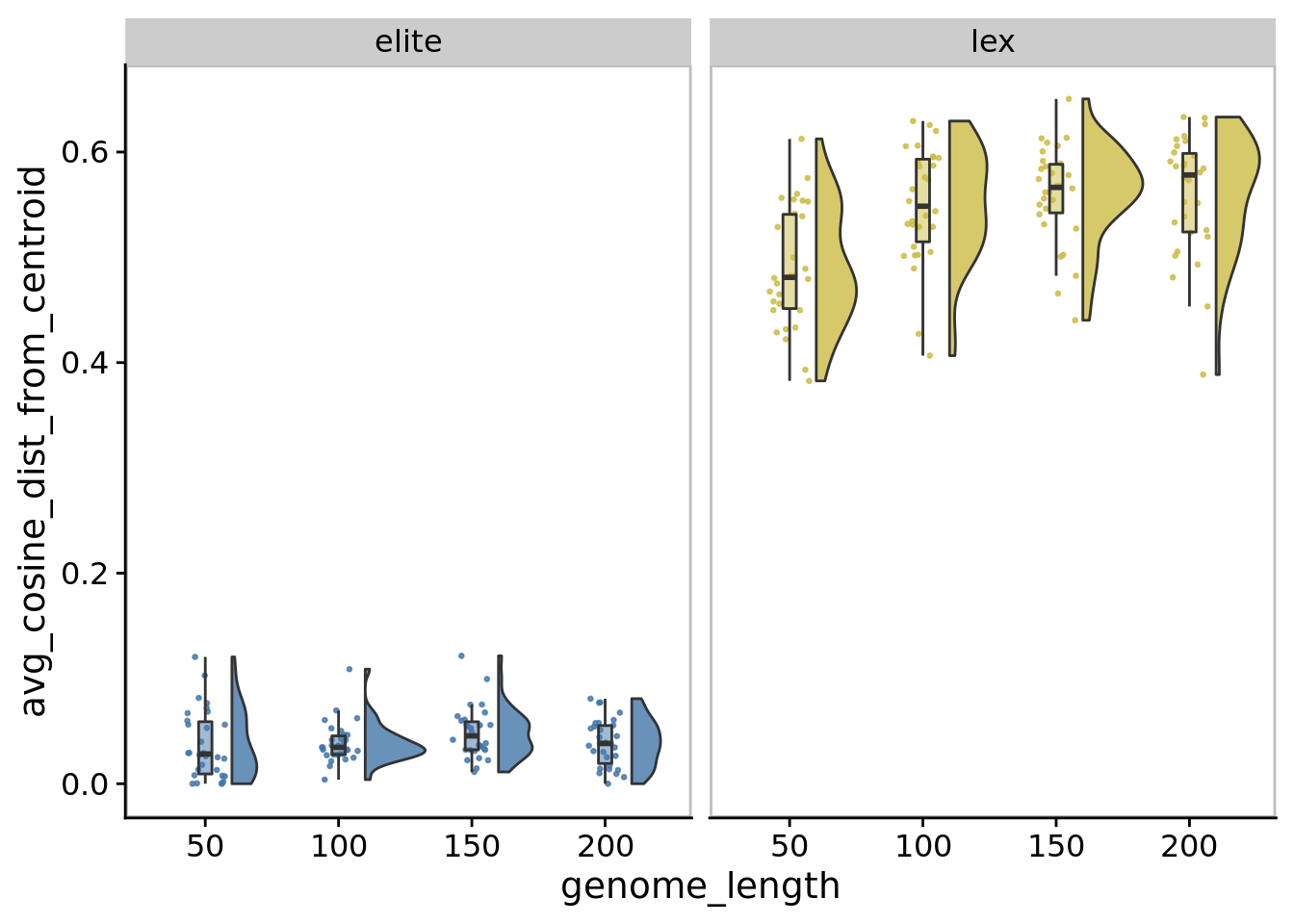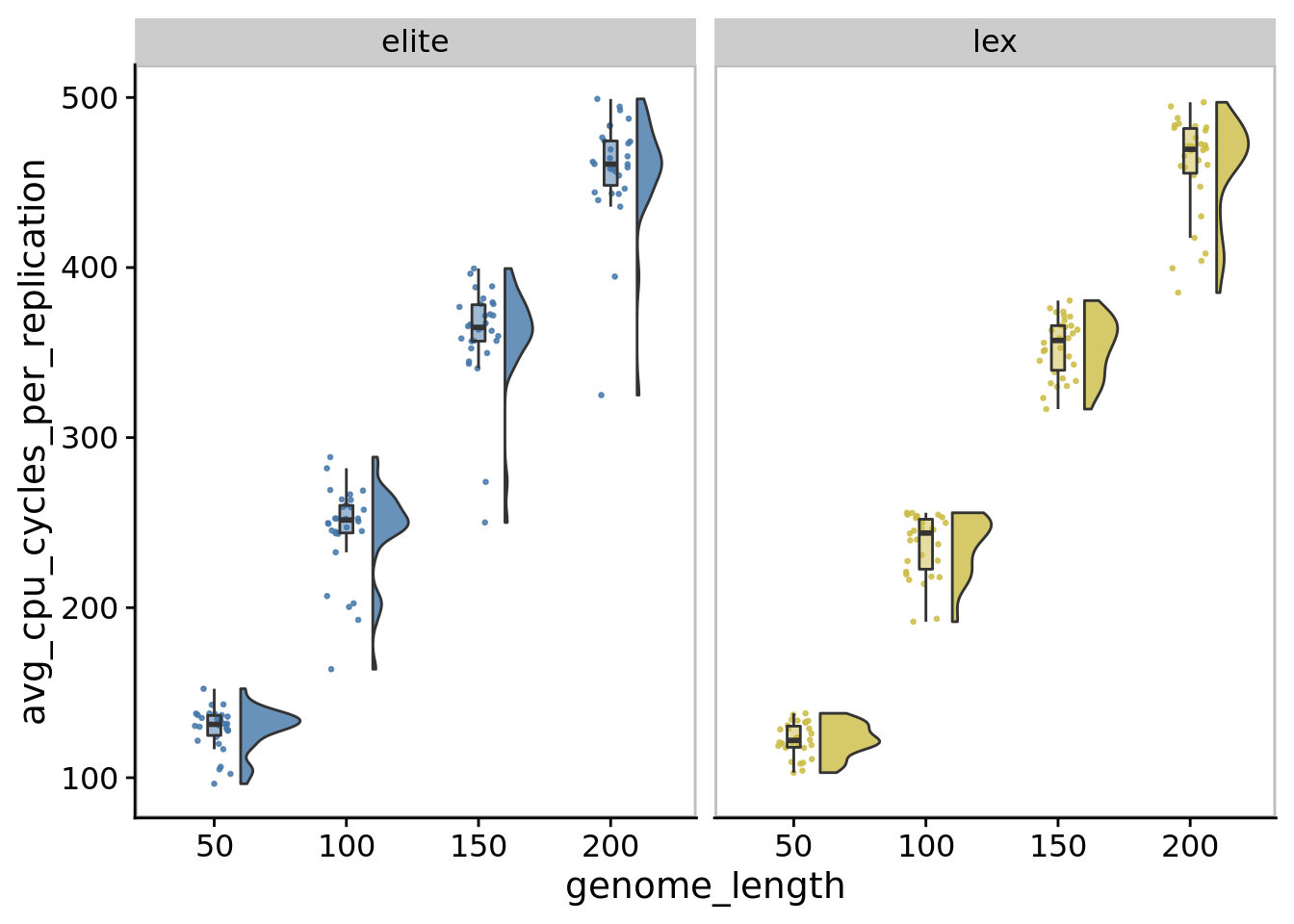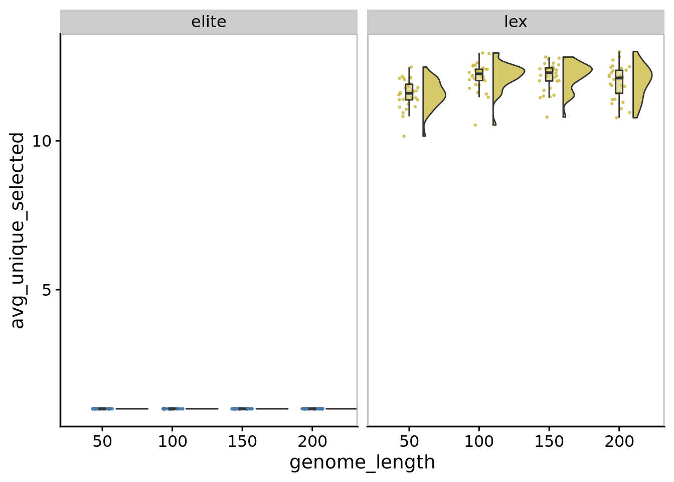 In our main experiments, we limited genome length to 100 instructions. We ran a supplemental experiment to evaluate whether this limit substantially affected the directed evolution performance. Specifically, for each of elite and lexicase selection, we ran 30 replicates of digital directed evolution with the following genome length configurations: 50, 100 (default used in our main experiments), 150, and 200.