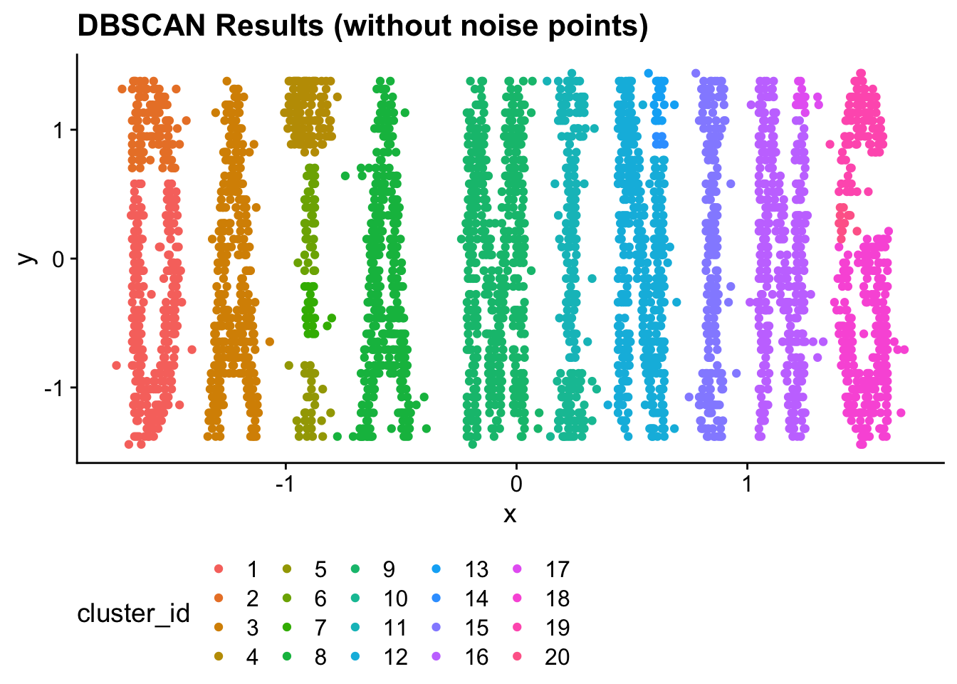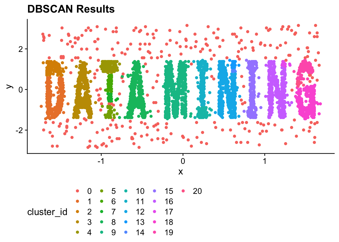 Note that all points in the “0” cluster are noise points. All other cluster IDs are real clusters. If we wanted to graph all of the clustered data points (i.e., exclude noise), we could use the dplyr filter function.