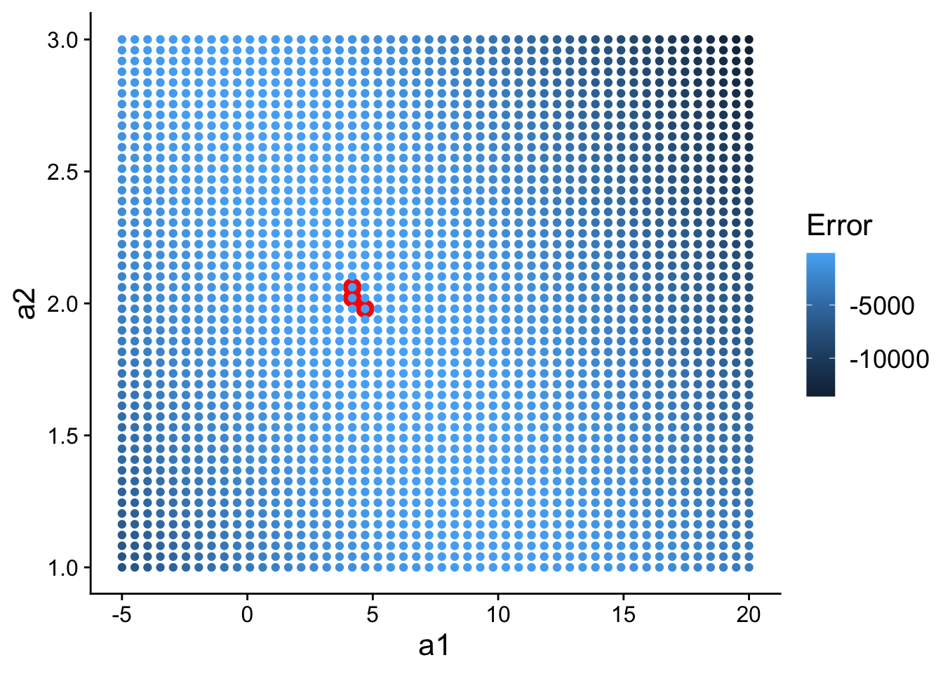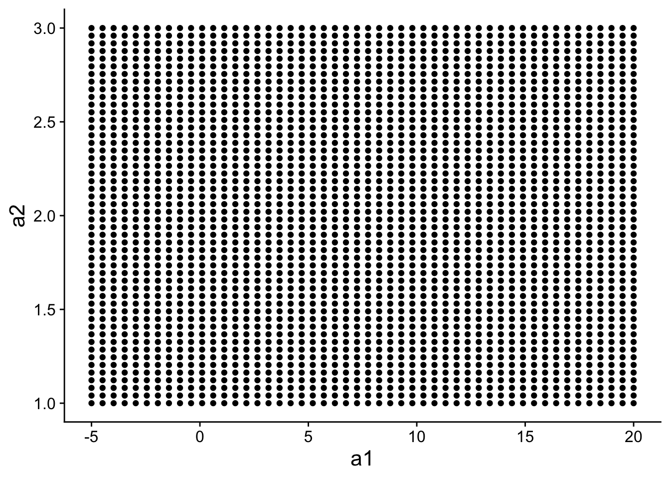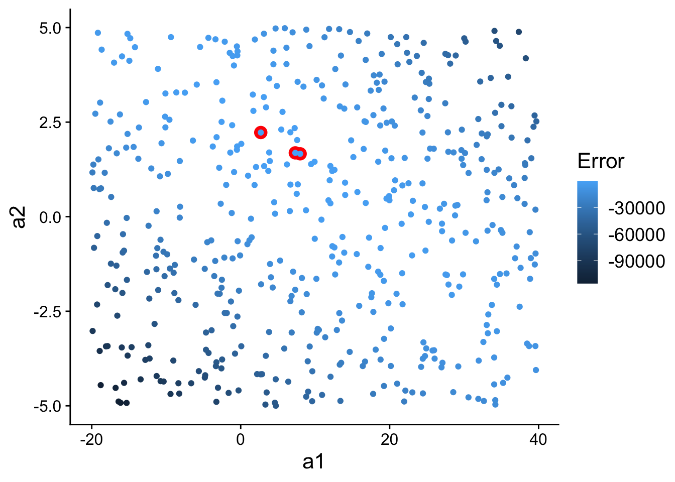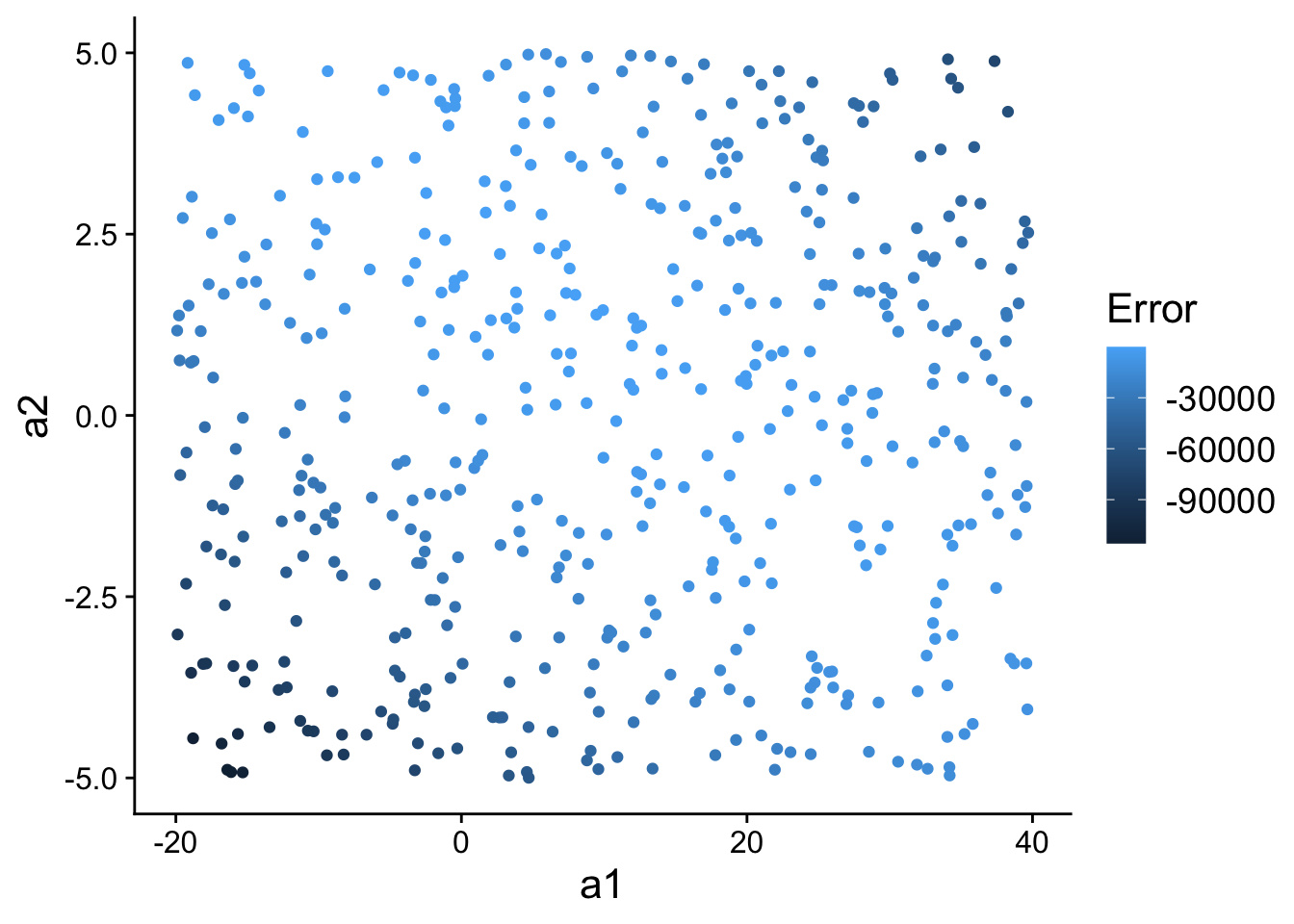 We could think of each model (defined by a1 and a2) as a point in “model space” (i.e., the space of all possible model parameterizations). That is, we could plot all 500 models we randomly generated according to their value for a1 and a2.