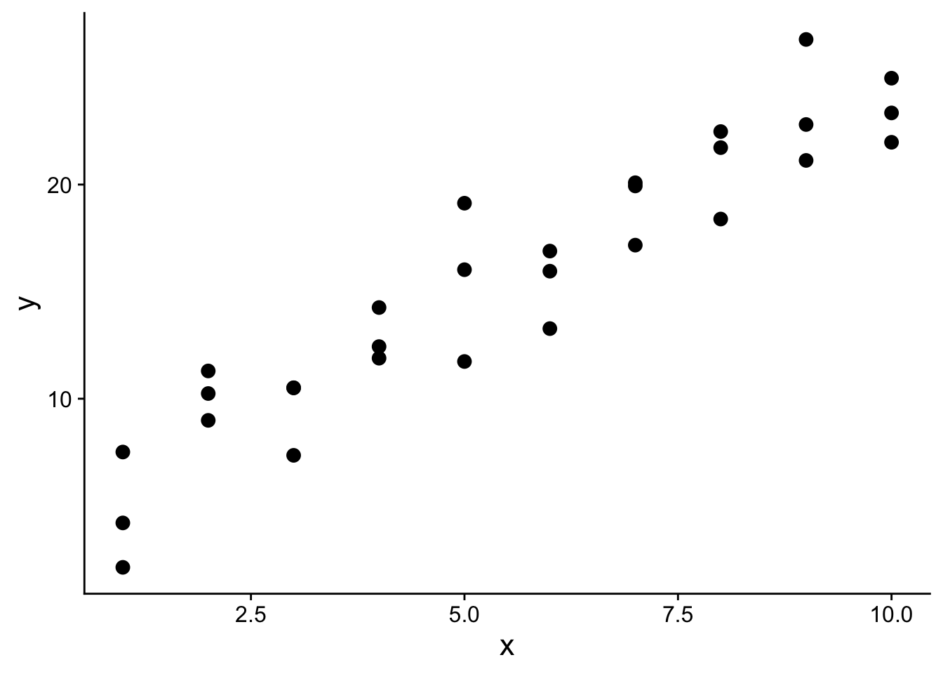 That is, we want to use linear regression to build a model that describes the relationship between our response variable, y, and our predictor variable, x.